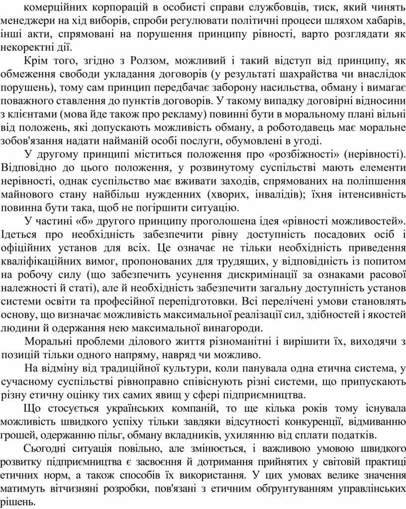 Крім того, згідно з Ролзом, можливий і такий відступ від принципу, як обмеження свободи укладання договорів (у результаті шахрайства чи внаслідок порушень), тому сам принцип передбачає заборону насильства, обману і вимагає поважного ставлення до пунктів договорів. У такому випадку договірні відносини з клієнтами (мова йде також про рекламу) повинні бути в моральному плані вільні від положень, які допускають можливість обману, а роботодавець має моральне зобов'язання надати найманій особі послуги, обумовлені в угоді.