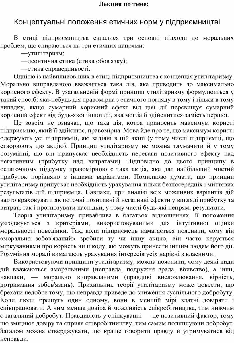 Однією із найвпливовіших в етиці підприємництва є концепція утилітаризму. Морально виправданою вважається така дія, яка приводить до максимально корисного ефекту. В узагальненій формі принцип утилітаризму формулюється у такий спосіб: яка-небудь дія правомірна з етичного погляду в тому і тільки в тому випадку, якщо сумарний корисний ефект від цієї дії перевищує сумарний корисний ефект від будь-якої іншої дії, яка мог.іа б здійснитися замість першої.