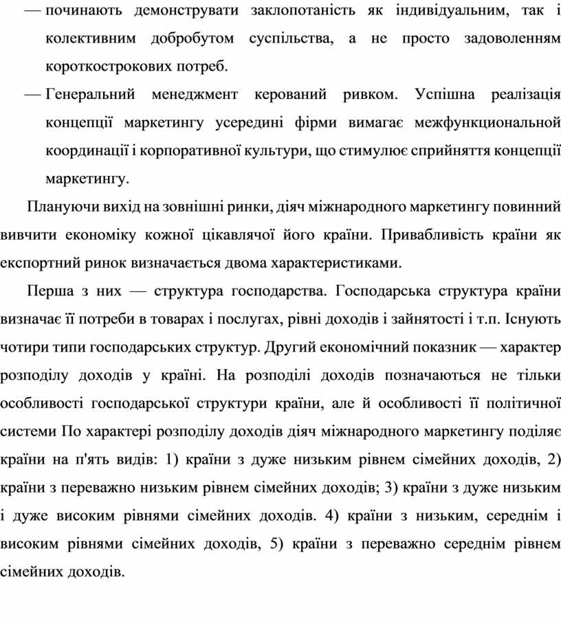 Перша з них — структура господарства. Господарська структура країни визначає її потреби в товарах і послугах, рівні доходів і зайнятості і т.п. Існують чотири типи господарських структур. Другий економічний показник — характер розподілу доходів у країні. На розподілі доходів позначаються не тільки особливості господарської структури країни, але й особливості її політичної системи По характері розподілу доходів діяч міжнародного маркетингу поділяє країни на п'ять видів: 1) країни з дуже низьким рівнем сімейних доходів, 2) країни з переважно низьким рівнем сімейних доходів; 3) країни з дуже низьким і дуже високим рівнями сімейних доходів. 4) країни з низьким, середнім і високим рівнями сімейних доходів, 5) країни з переважно середнім рівнем сімейних доходів.
