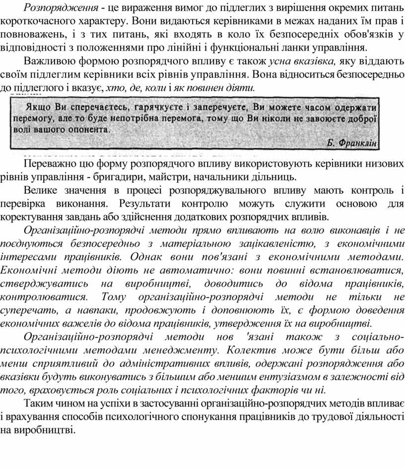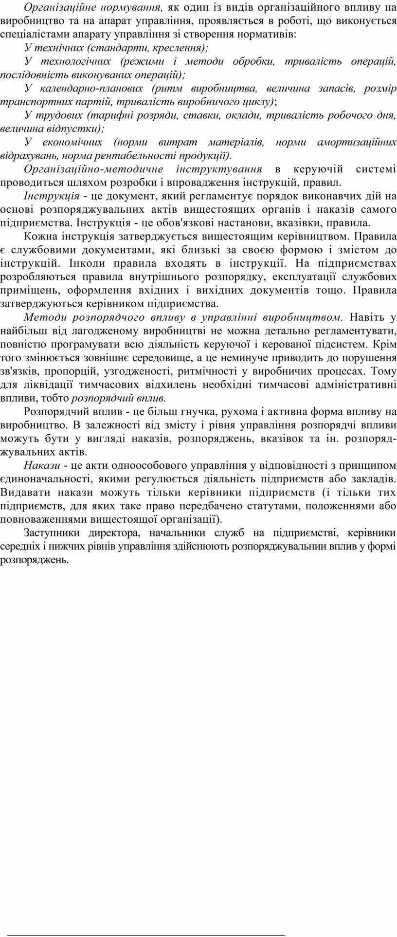Методи розпорядчого впливу в управлінні виробництвом. Навіть у найбільш від лагодженому виробництві не можна детально регламентувати, повністю програмувати всю діяльність керуючої і керованої підсистем. Крім того змінюється зовнішнє середовище, а це неминуче приводить до порушення зв'язків, пропорцій, узгодженості, ритмічності у виробничих процесах. Тому для ліквідації тимчасових відхилень необхідні тимчасові адміністративні впливи, тобто розпорядчий вплив.