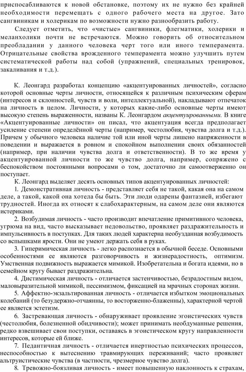 К. Леонгард выделяет десять основных типов акцентуированных личностей: