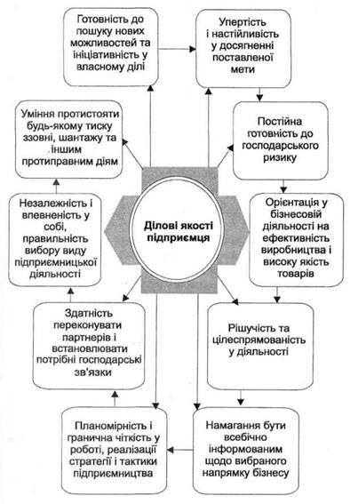 Бізнесмен повинен мати нахил до підприємництва і певні ділові якості й риси характеру. Японські вчені на основі п'ятирічних досліджень визначили ділові якості особистості підприємця. Найважливіші з них показані на рис. 1.
