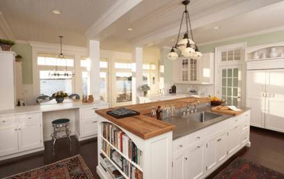 Островная кухня – это кухня любой планировки с дополнением в центре. Эта планировка подходит только для большого помещения (не менее 18 кв.м), ведь оптимальное расстояние от «острова» до фасадов кухонных 1,2 м. При этой планировке очень много вариантов для создания´шкафов должно быть не меньше 1 м. Наиболее удобные размеры «острова» – 1,2 оптимального рабочего треугольника. Рабочий треугольник не должен разделяться «островом». В традиционном исполнении на середину кухни выносится стол с мойкой или плитой. Главная трудность при осуществлении этого замысла – подключение плиты и вытяжки в центре помещения или прокладка водопровода под полом. «Островом» может быть обычный обеденный стол или тележка на колесах. Также можно использовать это пространство как рабочую поверхность, а шкафы использовать для хранения различной утвари.