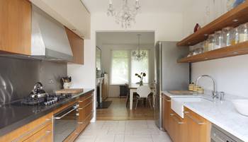 Линейная кухня рассчитана на одного или двух человек, устанавливается в очень ограниченном пространстве. Мебель и крупногабаритную бытовую технику располагают в одну линию вдоль стены. В этом случае для соблюдения "треугольника" раковину лучше расположить в центре, а плиту и холодильник – в противоположных концах ряда. Рабочая поверхность будет находиться между мойкой и плитой. Удобнее, когда все элементы кухни, включая мойку и плиту, объединены общей рабочей панелью. Однако такую планировку можно считать функциональной при длине стены от 2 до 3,6 м. В противном случае расстояние между рабочими зонами становится либо слишком маленьким, либо слишком большим. Ширина кухни должна быть не менее 2 м, чтобы 2 человека могли обойти друг друга. Если нет выдвижных или раскладных столов, то прием пищи осуществляется в другой комнате.