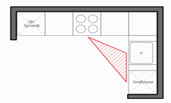 Если кухня угловая и имеет большие размеры, то расстояние между рабочими центрами (мойкой, плитой, холодильником) становится слишком большим, поэтому эти центры нужно расположить ближе друг к другу, оставив между ними рабочую поверхность.