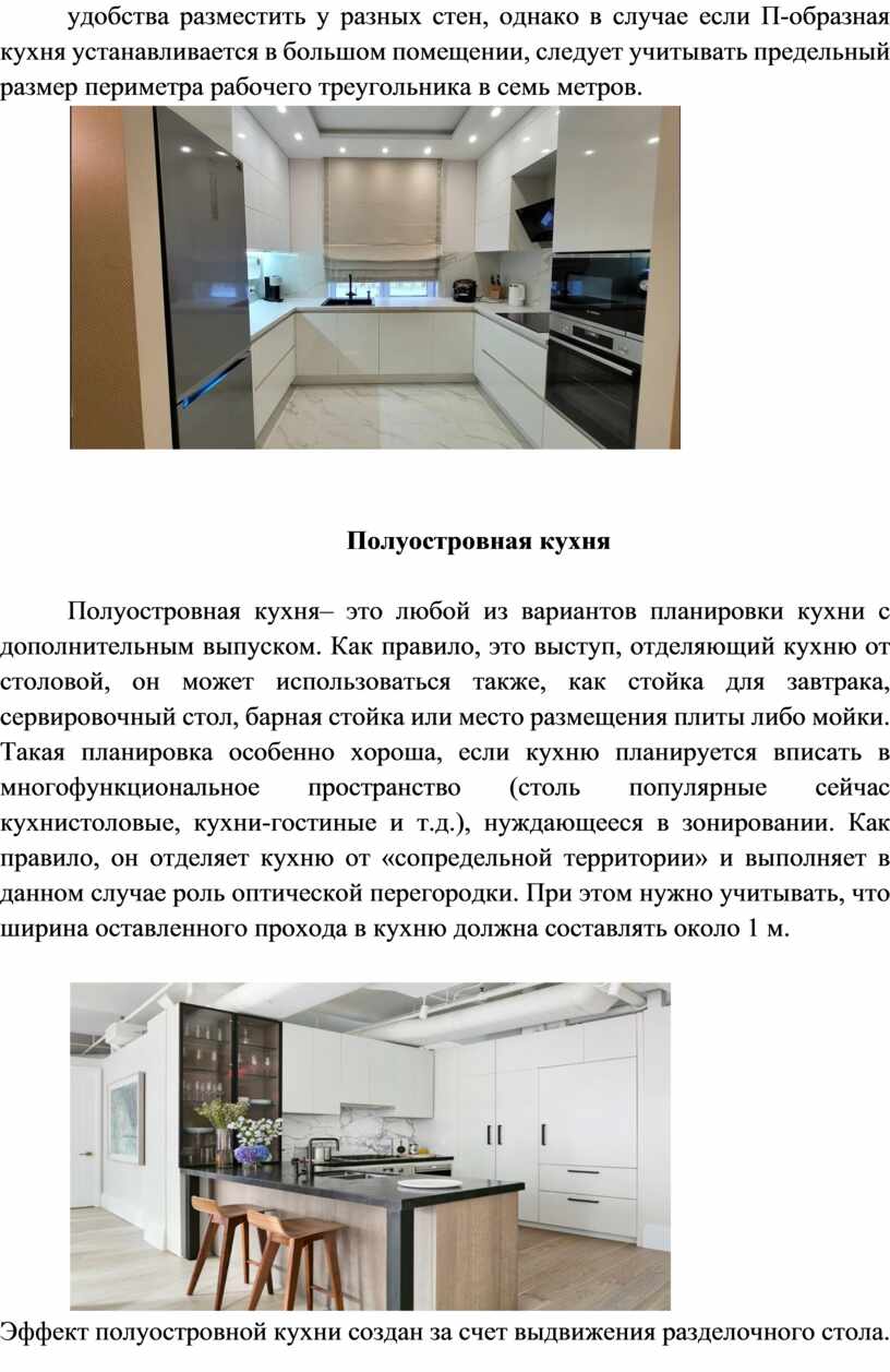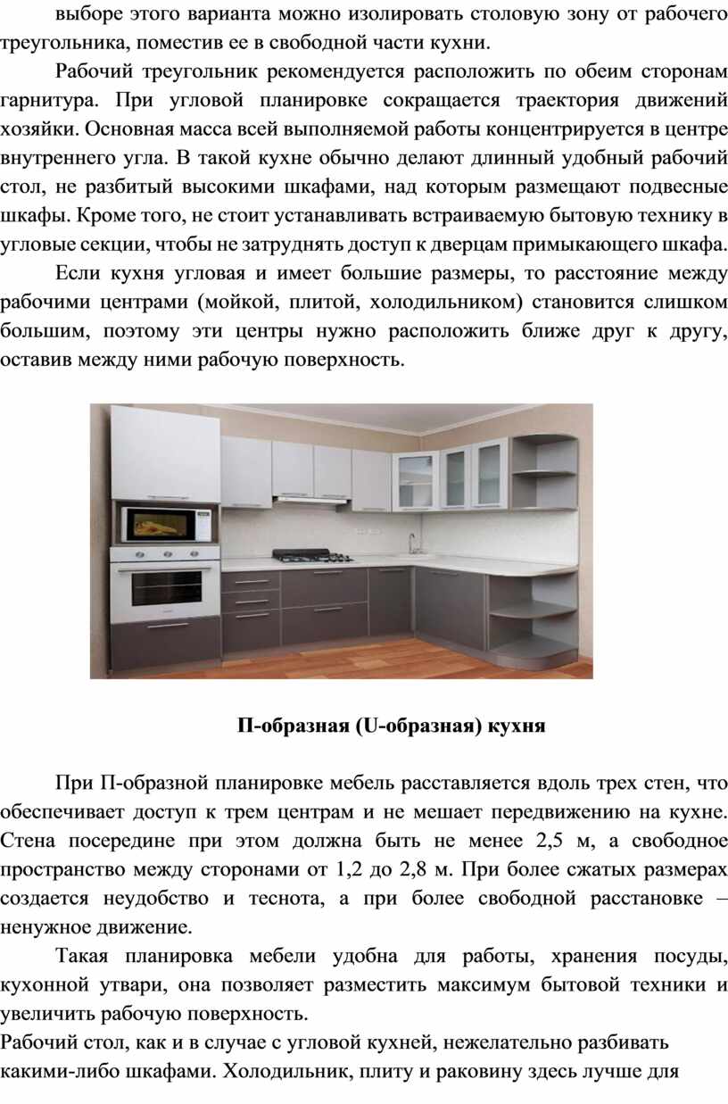 При П-образной планировке мебель расставляется вдоль трех стен, что обеспечивает доступ к трем центрам и не мешает передвижению на кухне. Стена посередине при этом должна быть не менее 2,5 м, а свободное пространство между сторонами от 1,2 до 2,8 м. При более сжатых размерах создается неудобство и теснота, а при более свободной расстановке – ненужное движение.