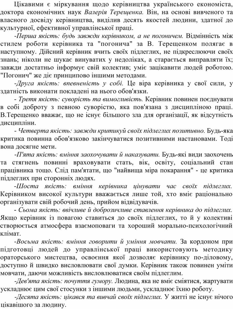 Цікавими є міркування щодо керівництва українського економіста, доктора економічних наук Валерія Терещенка. Він, на основі вивченого та власного досвіду керівництва, виділив десять якостей людини, здатної до культурної, ефективної управлінської праці.