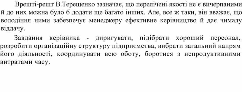 Врешті-решт В.Терещенко зазначає, що перелічені якості не є вичерпаними й до них можна було б додати ще багато інших. Але, все ж таки, він вважає, що володіння ними забезпечує менеджеру ефективне керівництво й дає чималу віддачу.