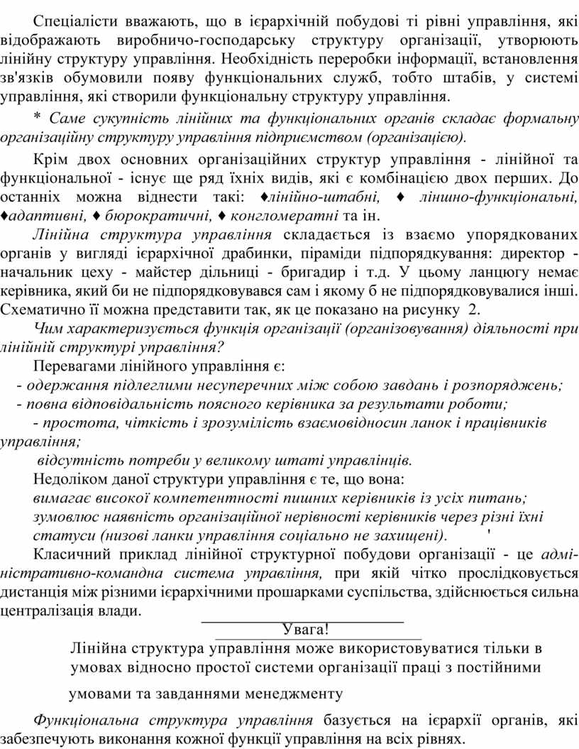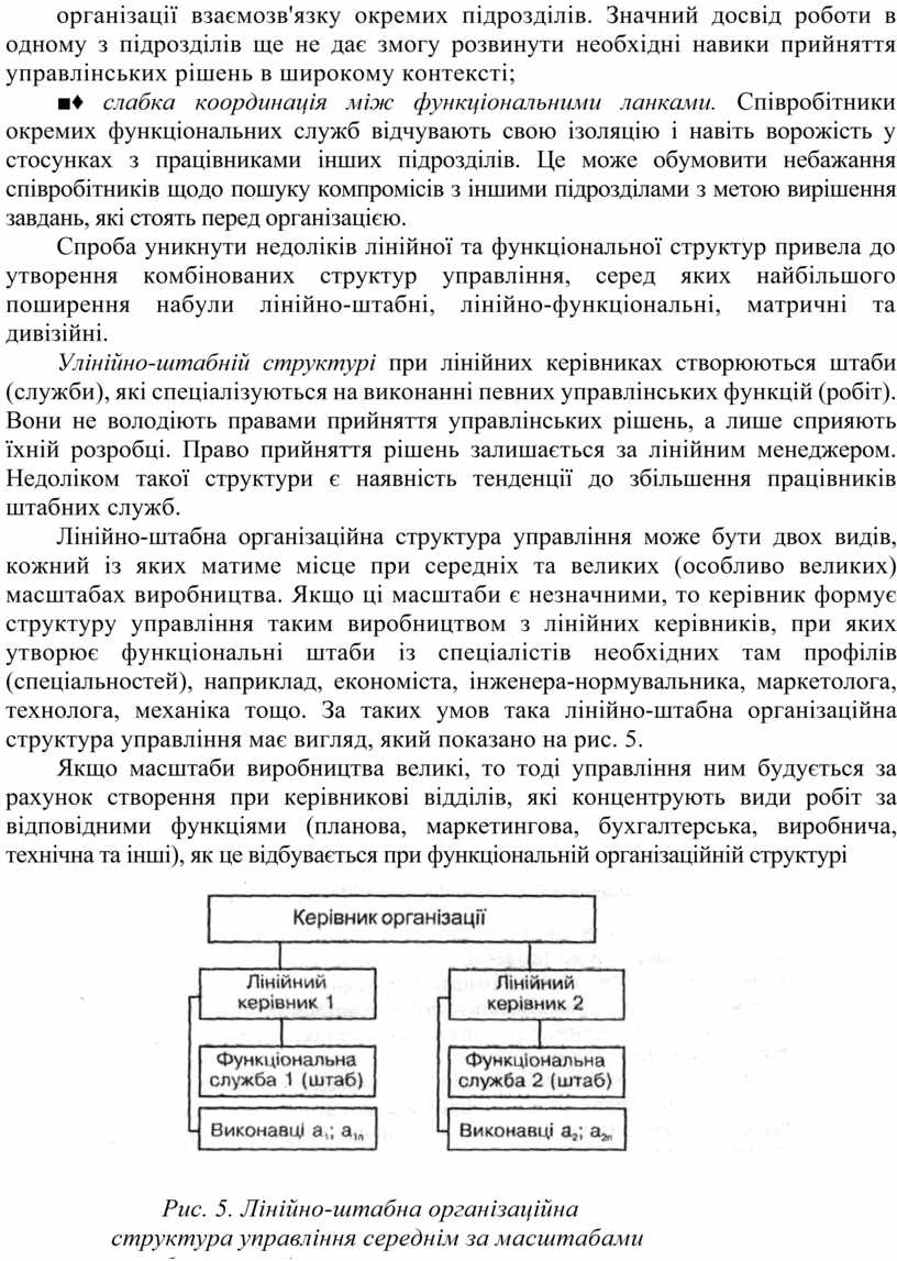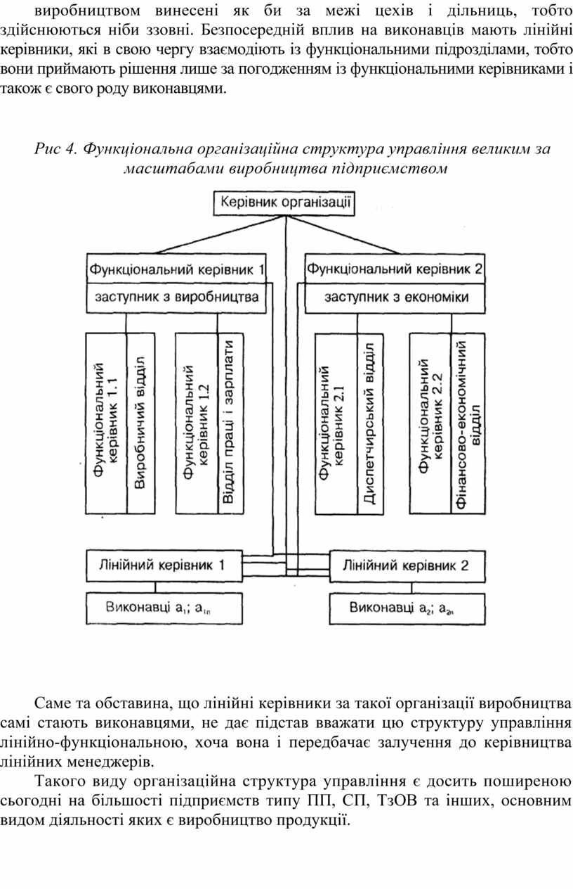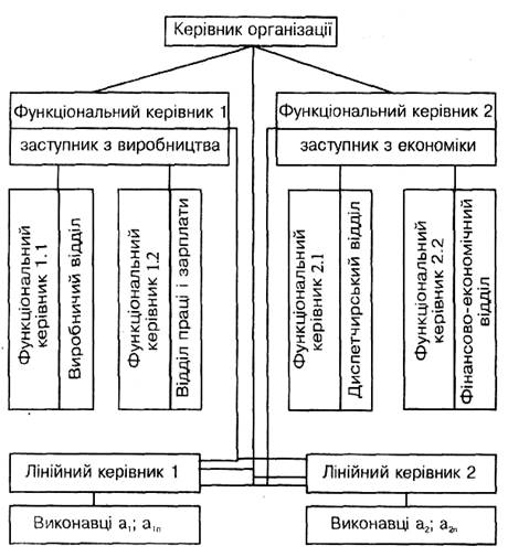Саме та обставина, що лінійні керівники за такої організації виробництва самі стають виконавцями, не дає підстав вважати цю структуру управління лінійно-функціональною, хоча вона і передбачає залучення до керівництва лінійних менеджерів.