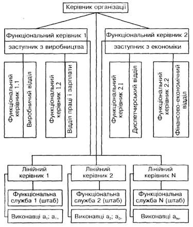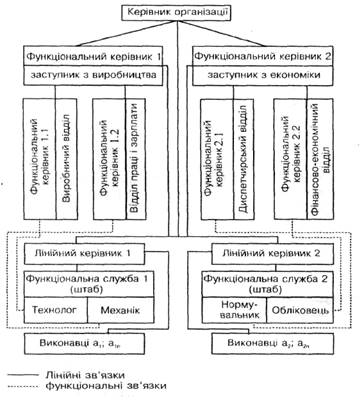 Лінійно-функціональна організаційна структура управління передбачає, що фунціональні служби вищого рівня отримують повноваження управління аналогічними службами нижчого рівня, які знаходяться при лінійних керівниках. Тобто, при цьому делегуються не лінійні, а функціональні повноваження. Так, відділ праці та заробітної плати підприємства може координувати діяльність цехового бюро праці та заробітної плати, хоч останнє знаходиться в лінійному підпорядкуванні начальника цеху. (Дивітьсярис. 8).