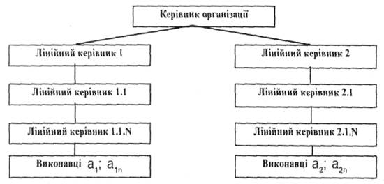 Лінійна структура управління складається із взаємо упорядкованих органів у вигляді ієрархічної драбинки, піраміди підпорядкування: директор - начальник цеху - майстер дільниці - бригадир і т.д. У цьому ланцюгу немає керівника, який би не підпорядковувався сам і якому б не підпорядковувалися інші. Схематично її можна представити так, як це показано на рисунку 2.