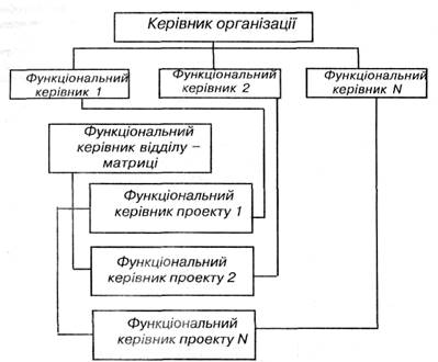 Матрична структура управління має місце тоді, коли підприємство виготовляє продукцію однорідну за своїм призначенням, але з різними технологічними параметрами. Як правило, така продукція вимагає розробки окремих проектів на неї, для чого на підприємствах утворюють спеціальні відділи, які займаються конкретними проектами (наприклад, проектуванням міських автобусів, туристських, міжміських). Такі відділи - матриці -концентрують свої зусилля на розв'язанні конкретних завдань. Члени проектних груп підпорядковуються як керівнику проекту, так і керівнику тих функціональних відділів, де вони працюють постійно (рис. 7.).