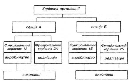 Якщо масштаби виробництва великі, то тоді управління ним будується за рахунок створення при керівникові відділів, які концентрують види робіт за відповідними функціями (планова, маркетингова, бухгалтерська, виробнича, технічна та інші), як це відбувається при функціональній організаційній структурі