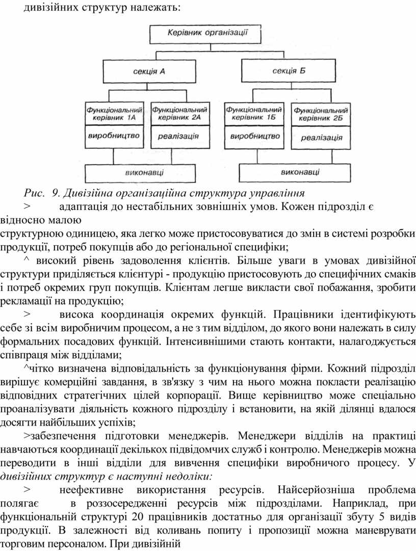 >забезпечення підготовки менеджерів. Менеджери відділів на практиці навчаються координації декількох підвідомчих служб і контролю. Менеджерів можна переводити в інші відділи для вивчення специфіки виробничого процесу. У дивізійних структур є наступні недоліки: