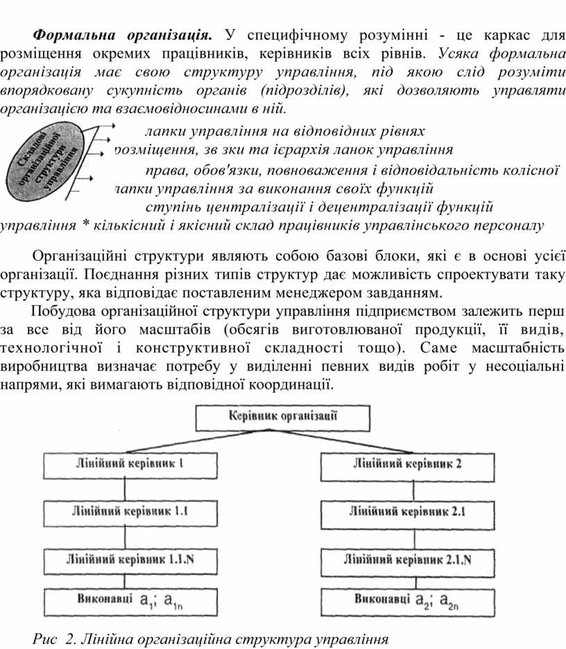 Формальна організація. У специфічному розумінні - це каркас для розміщення окремих працівників, керівників всіх рівнів. Усяка формальна організація має свою структуру управління, під якою слід розуміти впорядковану сукупність органів (підрозділів), які дозволяють управляти організацією та взаємовідносинами в ній.