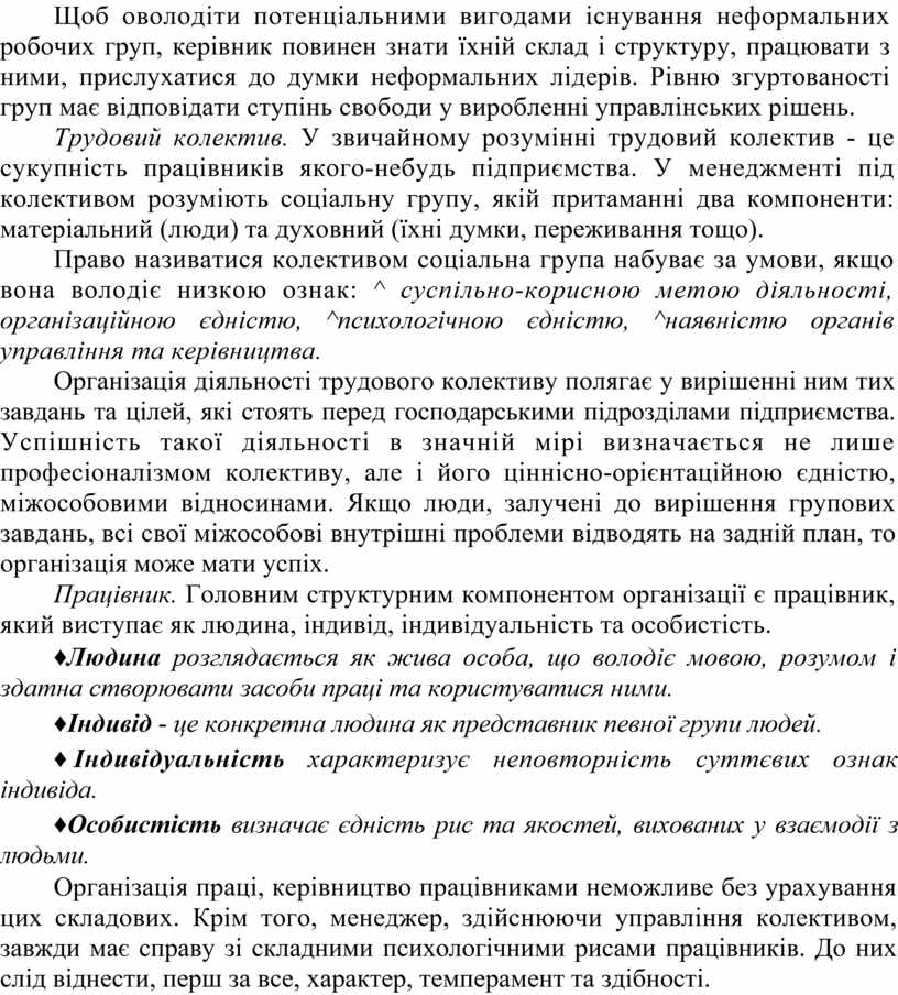 Трудовий колектив. У звичайному розумінні трудовий колектив - це сукупність працівників якого-небудь підприємства. У менеджменті під колективом розуміють соціальну групу, якій притаманні два компоненти: матеріальний (люди) та духовний (їхні думки, переживання тощо).
