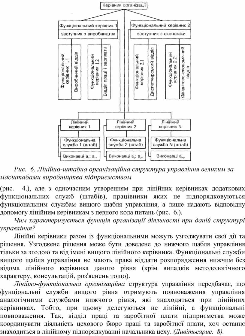 (рис. 4.), але з одночасним утворенням при лінійних керівниках додаткових функціональних служб (штабів), працівники яких не підпорядковуються функціональним службам вищого щабля управління, а лише надають відповідну допомогу лінійним керівникам з певного кола питань (рис. 6.).