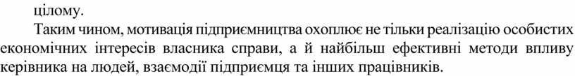 Таким чином, мотивація підприємництва охоплює не тільки реалізацію особистих економічних інтересів власника справи, а й найбільш ефективні методи впливу керівника на людей, взаємодії підприємця та інших працівників.