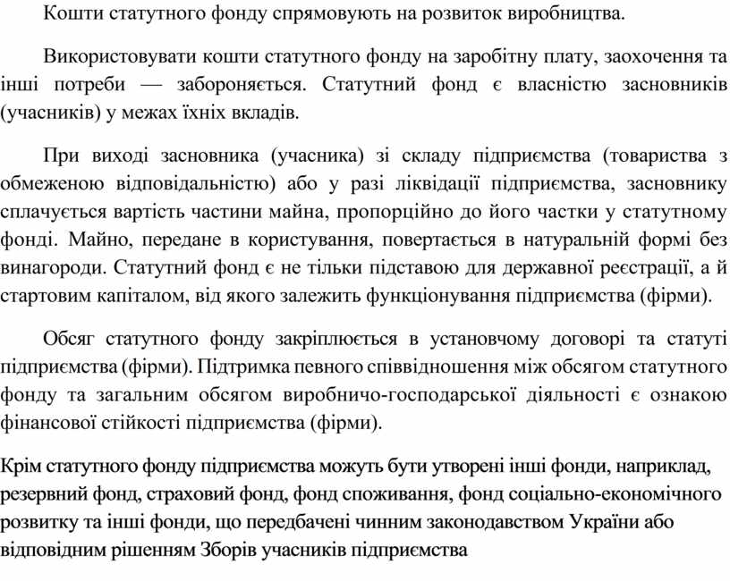 При виході засновника (учасника) зі складу підприємства (товариства з обмеженою відповідальністю) або у разі ліквідації підприємства, засновнику сплачується вартість частини майна, пропорційно до його частки у статутному фонді. Майно, передане в користування, повертається в натуральній формі без винагороди. Статутний фонд є не тільки підставою для державної реєстрації, а й стартовим капіталом, від якого залежить функціонування підприємства (фірми).