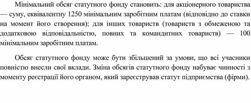 Мінімальний обсяг статутного фонду становить: для акціонерного товариства — суму, еквівалентну 1250 мінімальним заробітним платам (відповідно до ставки на момент його створення); для інших товариств (товариств з обмеженою та додатковою відповідальністю, повних та командитних товариств) — 100 мінімальним заробітним платам.