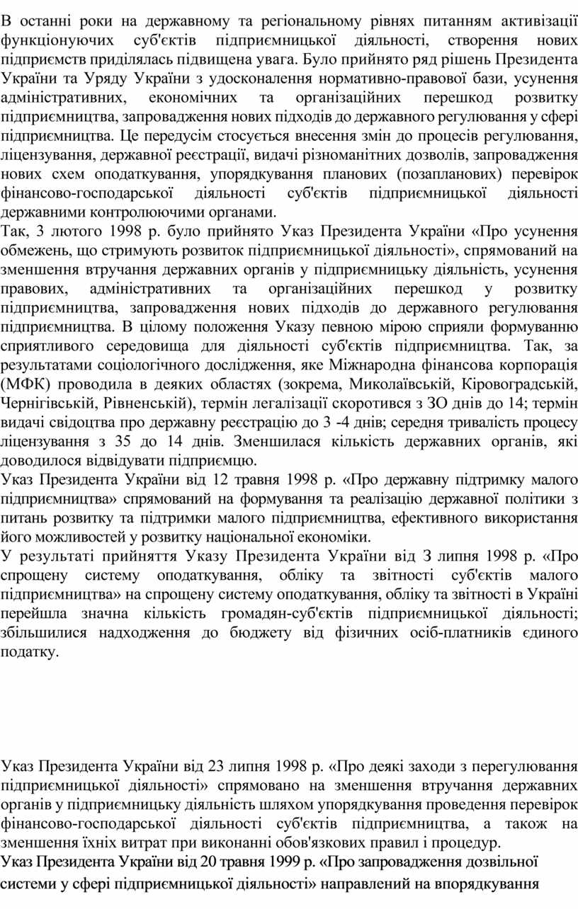 Так, 3 лютого 1998 р. було прийнято Указ Президента України «Про усунення обмежень, що стримують розвиток підприємницької діяльності», спрямований на зменшення втручання державних органів у підприємницьку діяльність, усунення правових, адміністративних та організаційних перешкод у розвитку підприємництва, запровадження нових підходів до державного регулювання підприємництва. В цілому положення Указу певною мірою сприяли формуванню сприятливого середовища для діяльності суб'єктів підприємництва. Так, за результатами соціологічного дослідження, яке Міжнародна фінансова корпорація (МФК) проводила в деяких областях (зокрема, Миколаївській, Кіровоградській, Чернігівській, Рівненській), термін легалізації скоротився з ЗО днів до 14; термін видачі свідоцтва про державну реєстрацію до 3 -4 днів; середня тривалість процесу ліцензування з 35 до 14 днів. Зменшилася кількість державних органів, які доводилося відвідувати підприємцю.