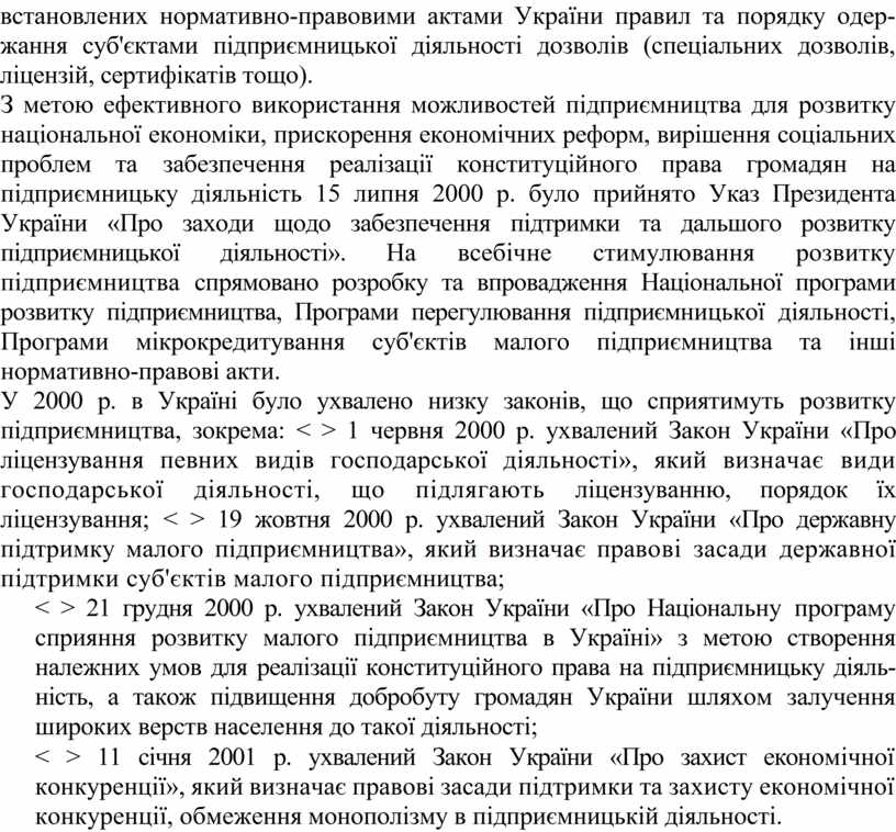 У 2000 р. в Україні було ухвалено низку законів, що сприятимуть розвитку підприємництва, зокрема: < > 1 червня 2000 р. ухвалений Закон України «Про ліцензування певних видів господарської діяльності», який визначає види господарської діяльності, що підлягають ліцензуванню, порядок їх ліцензування; < > 19 жовтня 2000 р. ухвалений Закон України «Про державну підтримку малого підприємництва», який визначає правові засади державної підтримки суб'єктів малого підприємництва;