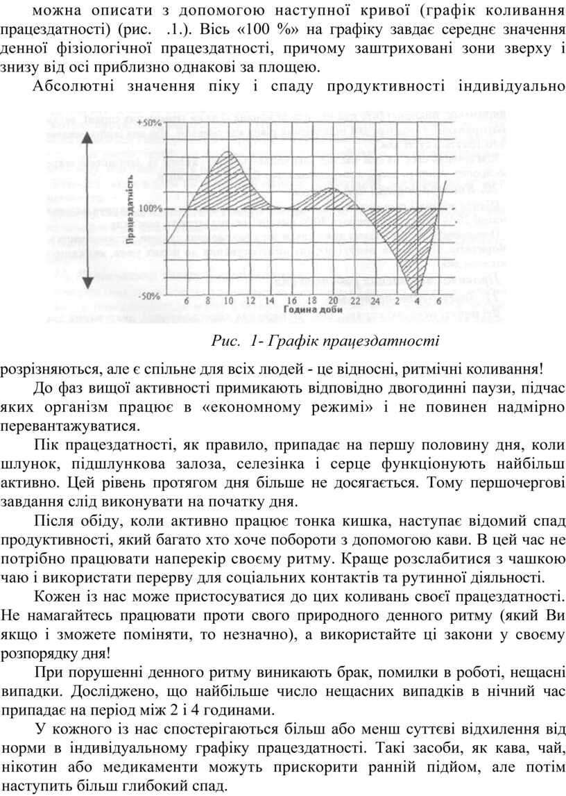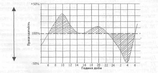 Ні один із цих основних типів не працює краще або гірше іншого, просто вони працюють по-різному. Пік працездатності у них припадає на різні періоди дня. Середньостатистичні коливання працездатності протягом доби можна описати з допомогою наступної кривої (графік коливання працездатності) (рис. .1.). Вісь «100 %» на графіку завдає середнє значення денної фізіологічної працездатності, причому заштриховані зони зверху і знизу від осі приблизно однакові за площею.