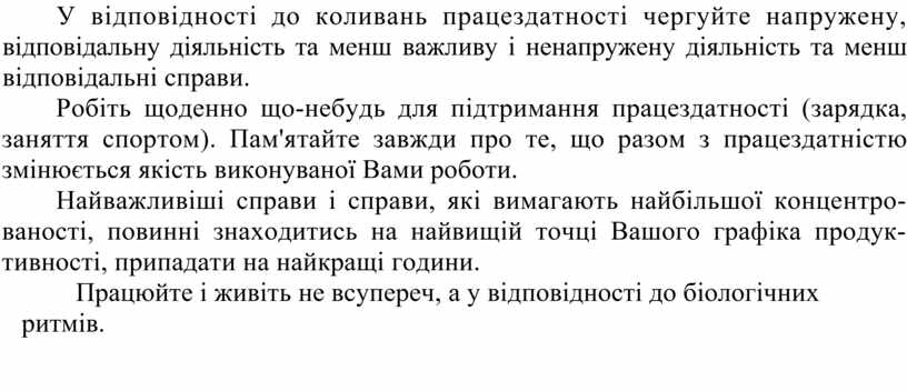 У відповідності до коливань працездатності чергуйте напружену, відповідальну діяльність та менш важливу і ненапружену діяльність та менш відповідальні справи.