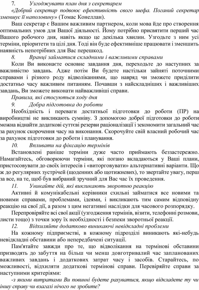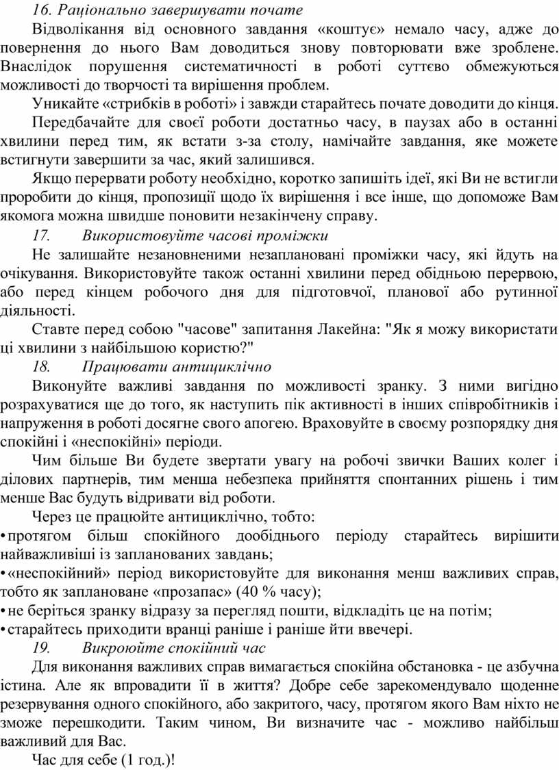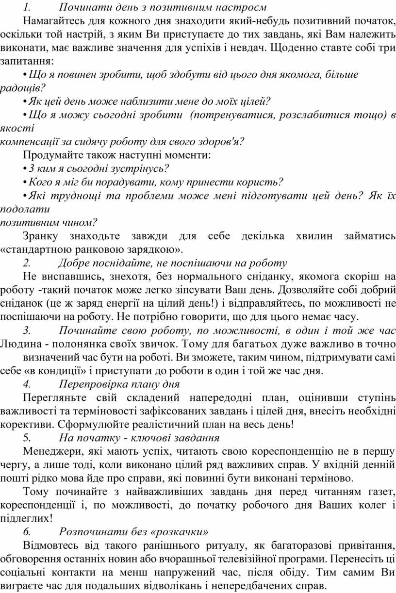Організація робочого дня менеджера повинна відповідати основному принципові: «Робота повинна підкорятися мені, а не навпаки».