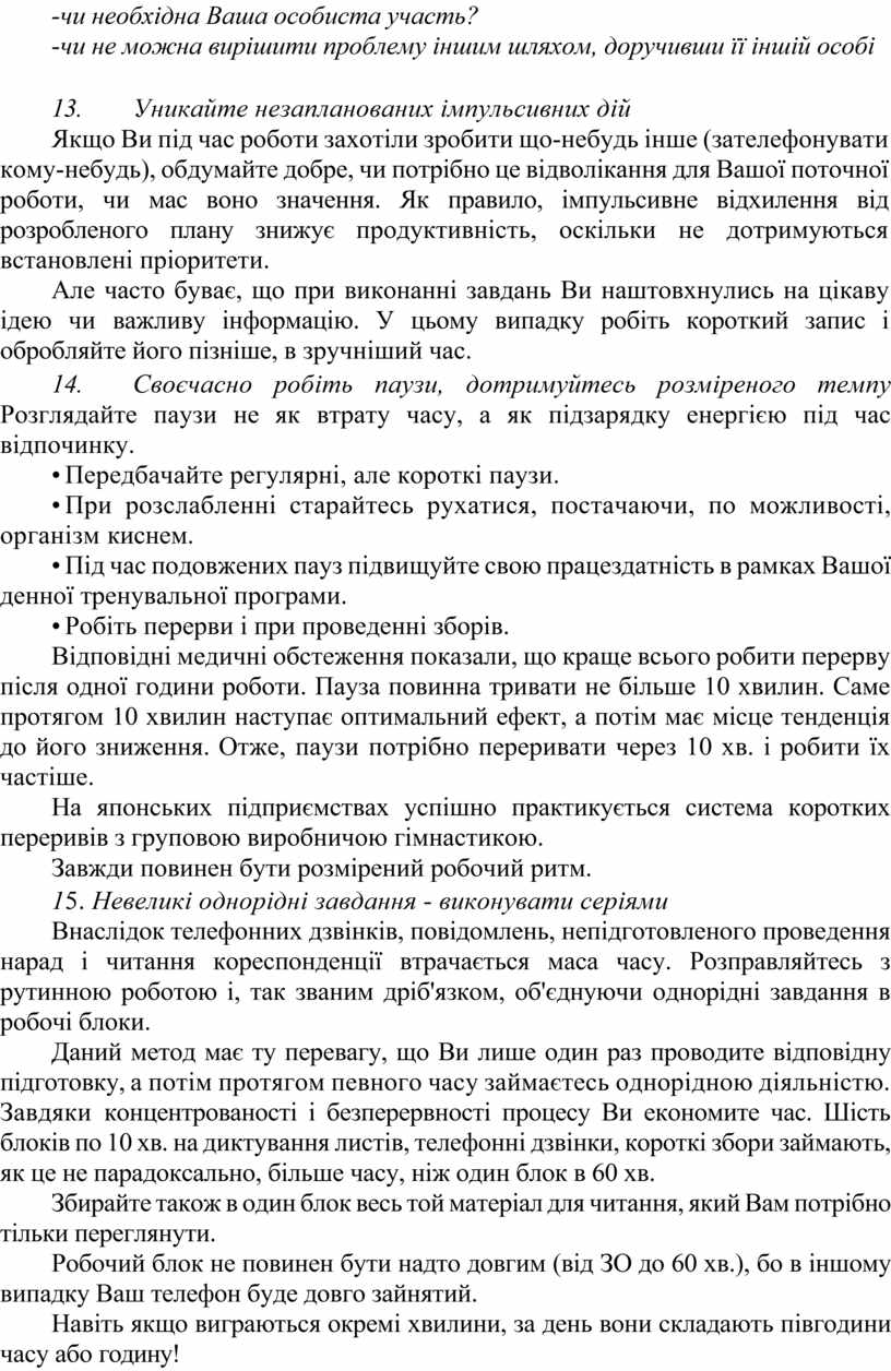 Якщо Ви під час роботи захотіли зробити що-небудь інше (зателефонувати кому-небудь), обдумайте добре, чи потрібно це відволікання для Вашої поточної роботи, чи мас воно значення. Як правило, імпульсивне відхилення від розробленого плану знижує продуктивність, оскільки не дотримуються встановлені пріоритети.
