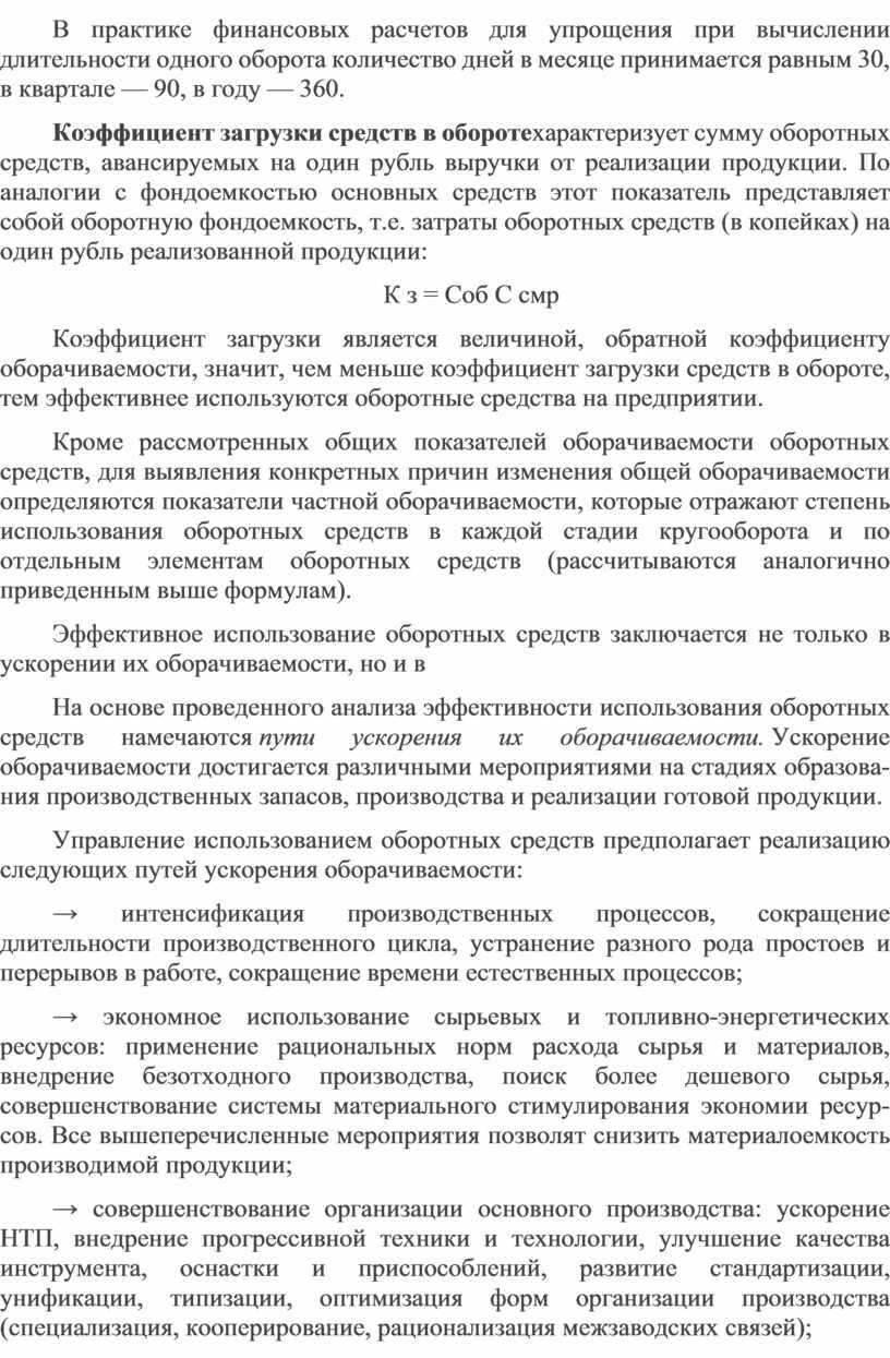 Коэффициент загрузки является величиной, обратной коэффициенту оборачиваемости, значит, чем меньше коэффициент загрузки средств в обороте, тем эффективнее используются оборотные средства на предприятии.