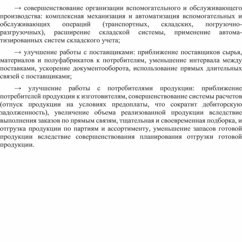 → улучшение работы с потребителями продукции: приближение потребителей продукции к изготовителям, совершенствование системы расчетов (отпуск продукции на условиях предоплаты, что сократит дебиторскую задолженность), увеличение объема реализованной продукции вследствие выполнения заказов по прямым связям, тщательная и своевременная подборка, и отгрузка продукции по партиям и ассортименту, уменьшение запасов готовой продукции вследствие совершенствования планирования отгрузки готовой продукции.