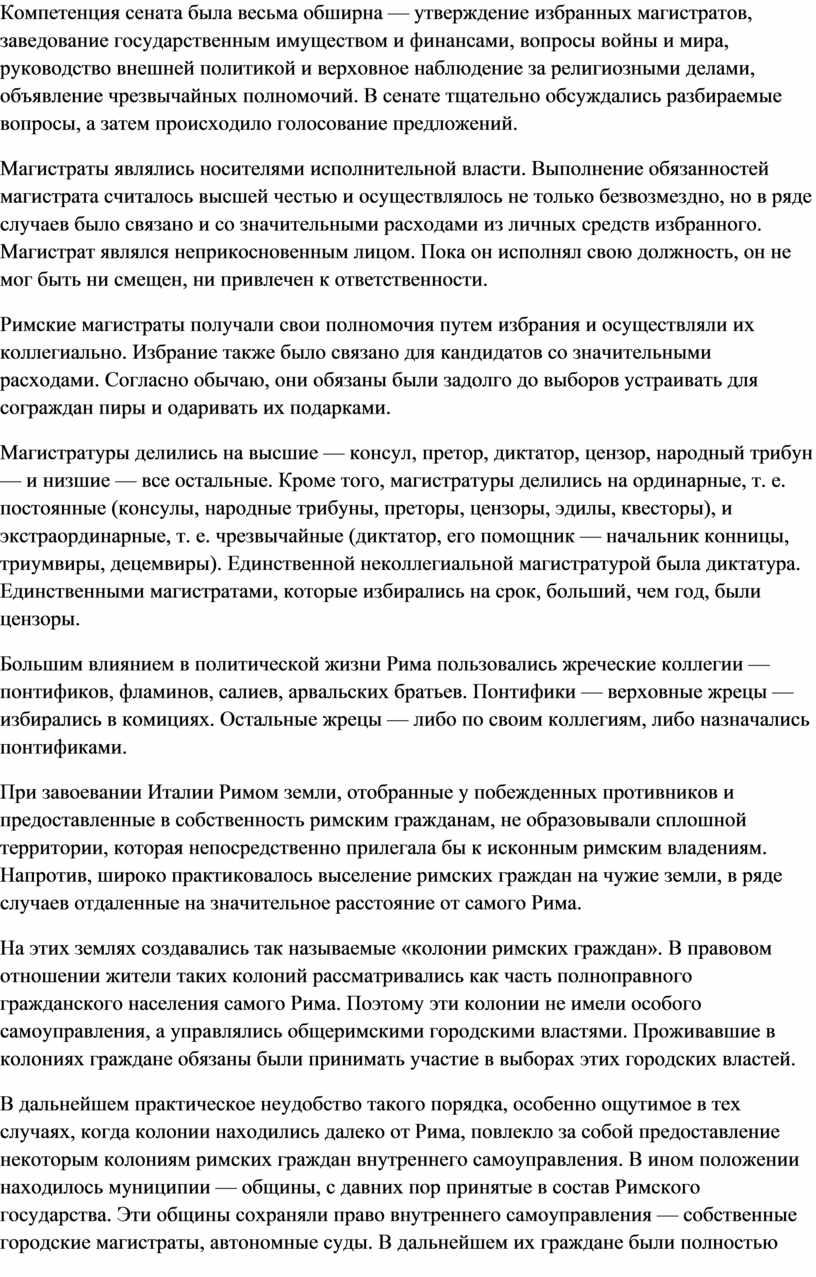 Около 509 г. до н.э. восстание местного населения в Риме привело к свержению этрусских царей и установлению республиканской формы правления.Управление перешло к избираемым высшим магистратам и сенату. Сенат из 300 человек - представителей аристократических родов (патрициев) и бывших магистратов - играл большую роль в жизни Рима. Высшими магистратами были два равноправных консула, избиравшихся на один год. В случае чрезвычайных ситуаций сенат назначал диктатора. Ниже консулов в структуре исполнительной власти стояли преторы. Диктаторы, консулы и преторы имели широкие полномочия. Полномочия остальных должностных лиц - цензоров, курульных эдилов, с 477 г. до н.э. квесторов - были ограниченными.Центуриатные комиции - собрание членов военной организации патрициев и плебеев, - состояли из 193 центурий (сотен), имевших по одному голосу, где главенствовала аристократия (98 сотен). Центуриатные комиции выбирали магистратов, решали вопросы о войне и мире, принимали законы и были высшей судебной инстанцией. После 494 г., в ходе борьбы плебеев и патрициев, возникли трибутные комиции (собрание граждан по территориальным округам - трибам). Их законы стали обязательными и для патрициев. Собрание избирало народных трибунов, которые защищали плебеев от произвола аристократии.