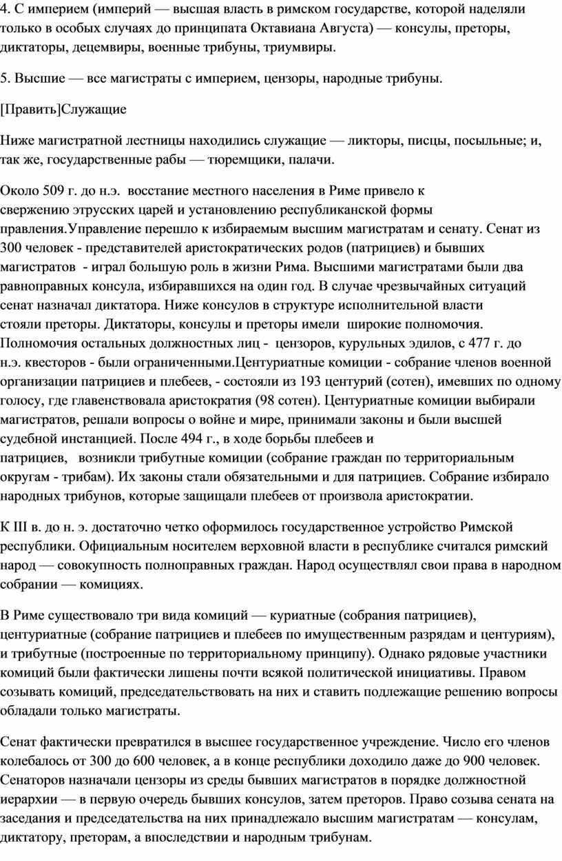4. С империем (империй — высшая власть в римском государстве, которой наделяли только в особых случаях до принципата Октавиана Августа) — консулы, преторы, диктаторы, децемвиры, военные трибуны, триумвиры.