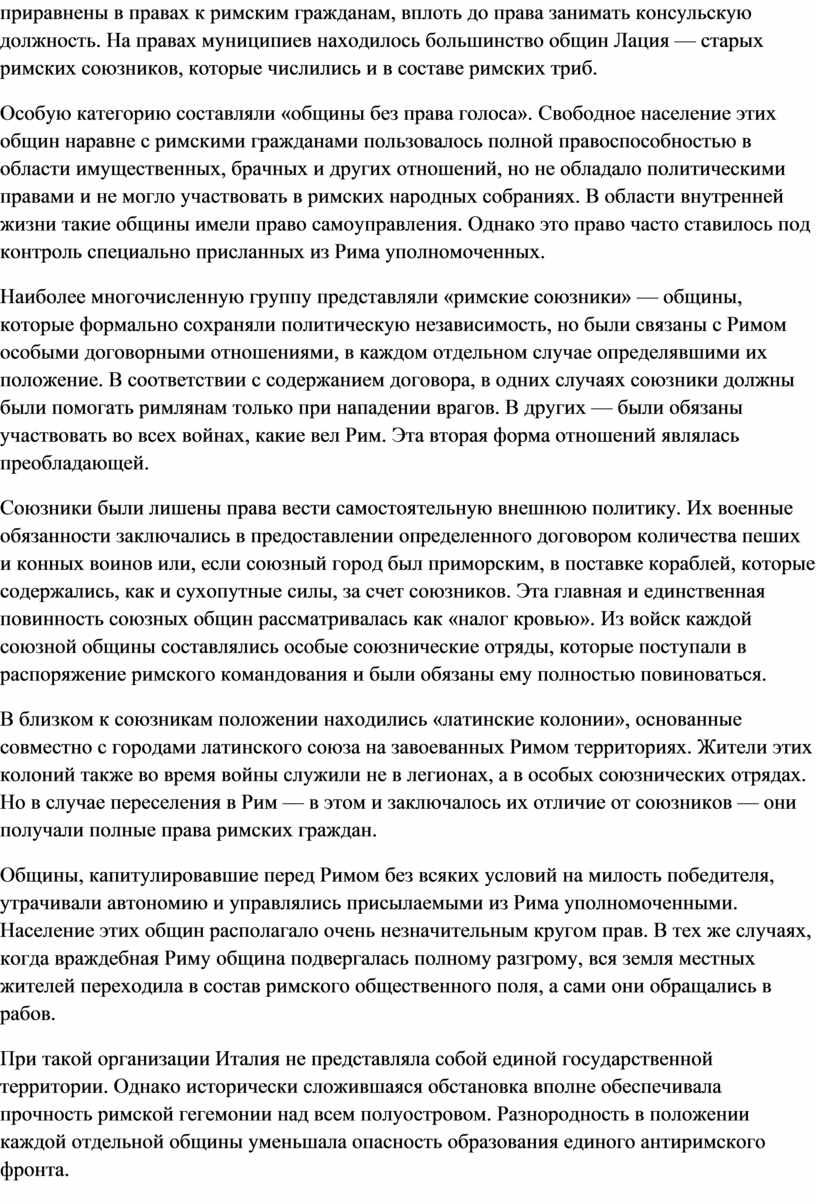 При такой организации Италия не представляла собой единой государственной территории. Однако исторически сложившаяся обстановка вполне обеспечивала прочность римской гегемонии над всем полуостровом. Разнородность в положении каждой отдельной общины уменьшала опасность образования единого антиримского фронта.