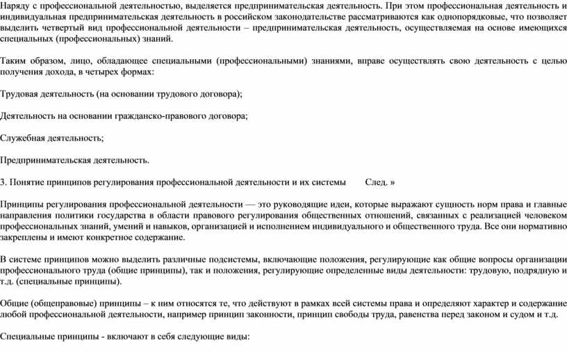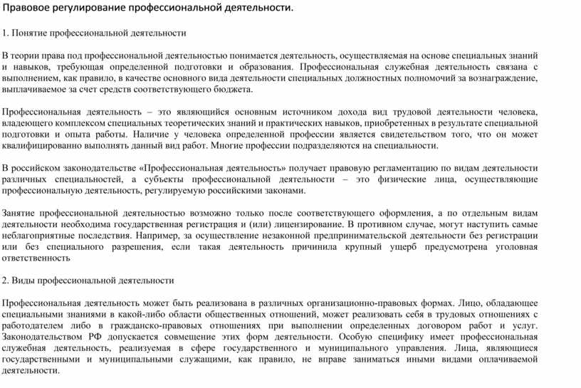 1. Понятие профессиональной деятельности В теории права под профессиональной деятельностью понимается деятельность, осуществляемая на основе специальных знаний и навыков, требующая определенной подготовки и образования. Профессиональная служебная деятельность связана с выполнением, как правило, в качестве основного вида деятельности специальных должностных полномочий за вознаграждение, выплачиваемое за счет средств соответствующего бюджета. Профессиональная деятельность – это являющийся основным источником дохода вид трудовой деятельности человека, владеющего комплексом специальных теоретических знаний и практических навыков, приобретенных в результате специальной подготовки и опыта работы. Наличие у человека определенной профессии является свидетельством того, что он может квалифицированно выполнять данный вид работ. Многие профессии подразделяются на специальности. В российском законодательстве «Профессиональная деятельность» получает правовую регламентацию по видам деятельности различных специальностей, а субъекты профессиональной деятельности – это физические лица, осуществляющие профессиональную деятельность, регулируемую российскими законами. Занятие профессиональной деятельностью возможно только после соответствующего оформления, а по отдельным видам деятельности необходима государственная регистрация и (или) лицензирование. В противном случае, могут наступить самые неблагоприятные последствия. Например, за осуществление незаконной предпринимательской деятельности без регистрации или без специального разрешения, если такая деятельность причинила крупный ущерб предусмотрена уголовная ответственность 2. Виды профессиональной деятельности Профессиональная деятельность может быть реализована в различных организационно-правовых формах. Лицо, обладающее специальными знаниями в какой-либо области общественных отношений, может реализовать себя в трудовых отношениях с работодателем либо в гражданско-правовых отношениях при выполнении определенных договором работ и услуг. Законодательством РФ допускается совмещение этих форм деятельности. Особую специфику имеет профессиональная служебная деятельность, реализуемая в сфере государственного и муниципального управления. Лица, являющиеся государственными и муниципальными служащими, как правило, не вправе заниматься иными видами оплачиваемой деятельности. Наряду с профессиональной деятельностью, выделяется предпринимательская деятельность. При этом профессиональная деятельность и индивидуальная предпринимательская деятельность в российском законодательстве рассматриваются как однопорядковые, что позволяет выделить четвертый вид профессиональной деятельности – предпринимательская деятельность, осуществляемая на основе имеющихся специальных (профессиональных) знаний. Таким образом, лицо, обладающее специальными (профессиональными) знаниями, вправе осуществлять свою деятельность с целью получения дохода, в четырех формах: Трудовая деятельность (на основании трудового договора); Деятельность на основании гражданско-правового договора; Служебная деятельность; Предпринимательская деятельность. 3. Понятие принципов регулирования профессиональной деятельности и их системы След. » Принципы регулирования проф