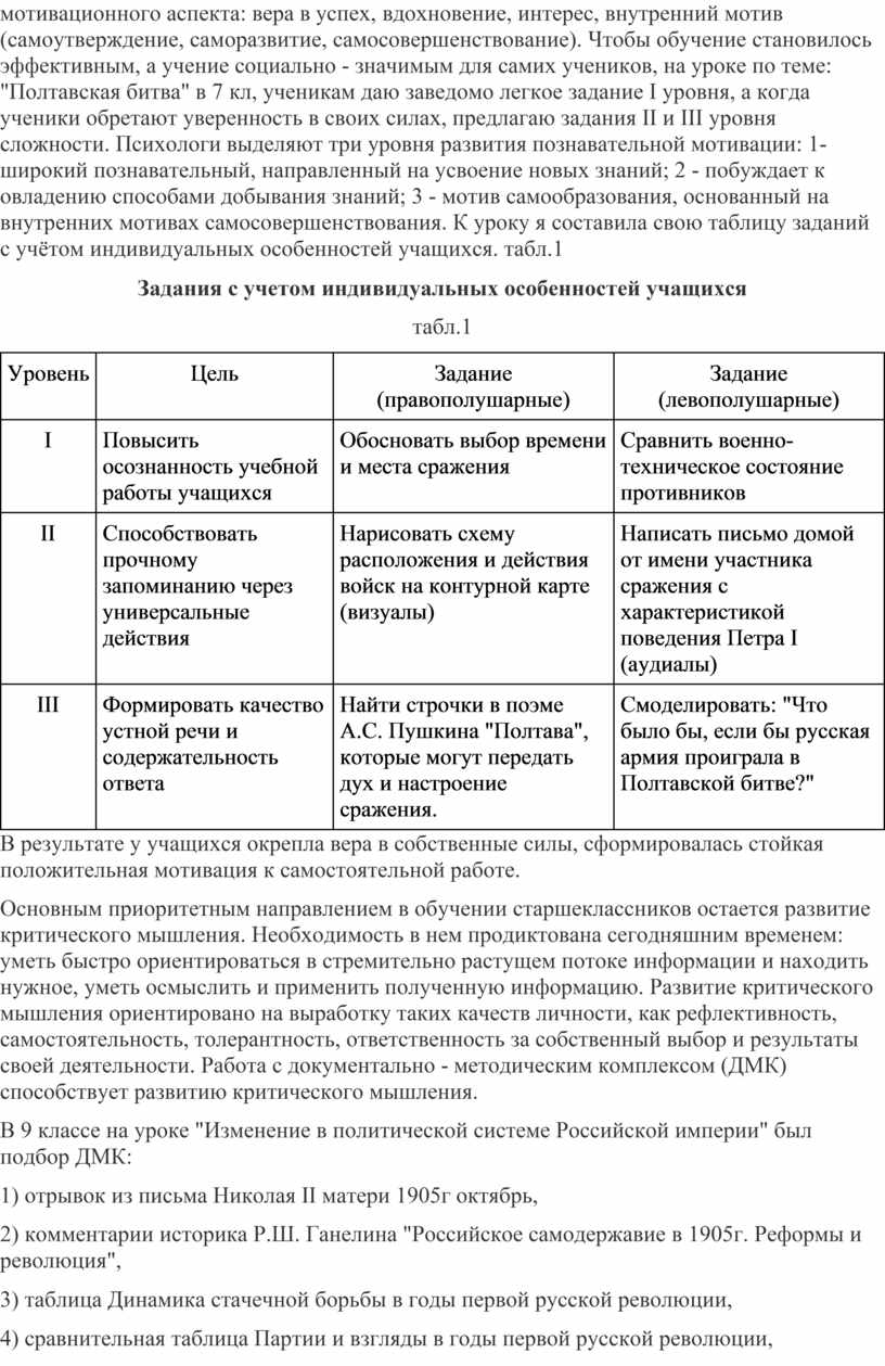 Формированию компетенций в сфере самостоятельной познавательной деятельности, в гражданско-общественной и социально - групповой деятельности способствует цепочка мотивационного аспекта: вера в успех, вдохновение, интерес, внутренний мотив (самоутверждение, саморазвитие, самосовершенствование). Чтобы обучение становилось эффективным, а учение социально - значимым для самих учеников, на уроке по теме: "Полтавская битва" в 7 кл, ученикам даю заведомо легкое задание I уровня, а когда ученики обретают уверенность в своих силах, предлагаю задания II и III уровня сложности. Психологи выделяют три уровня развития познавательной мотивации: 1- широкий познавательный, направленный на усвоение новых знаний; 2 - побуждает к овладению способами добывания знаний; 3 - мотив самообразования, основанный на внутренних мотивах самосовершенствования. К уроку я составила свою таблицу заданий с учётом индивидуальных особенностей учащихся. табл.1