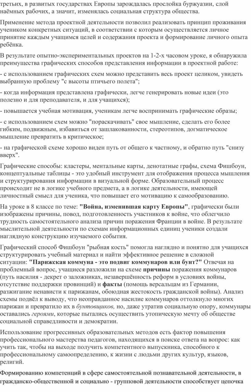 Графический способ Фишбоун "рыбная кость" помогла наглядно и понятно для учащихся структурировать учебный материал и найти эффективное решение в сложной ситуации: "Парижская коммуна - это подвиг коммунаров или бунт?" Отвечая на проблемный вопрос, учащиеся разложили на схеме причины поражения коммунаров (путь насилия - декрет о заложниках, незавершённость реформ в условиях войны, отсутствие поддержки провинций) и факты (помощь версальцам из Германии, разжигание ненависти к парижанам, обоюдная жестокость гражданской войны). Анализ схемы подвёл к выводу, что неоправданное насилие коммунаров оттолкнуло многих парижан и превратило их в бунтовщиков, но, даже утратив социальную опору, коммунары оставались героями, которые пытались осуществить утопическую мечту об обществе социальной справедливости и демократии.