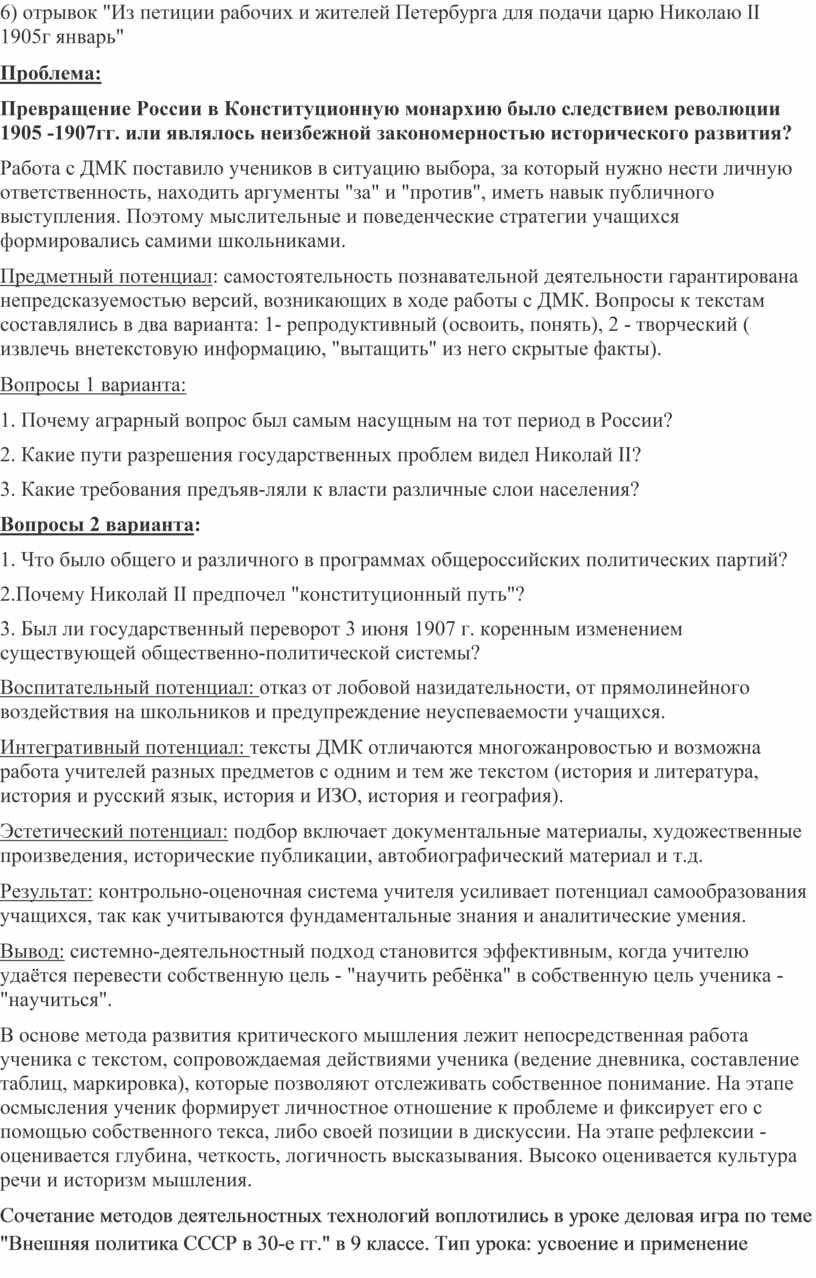 6) отрывок "Из петиции рабочих и жителей Петербурга для подачи царю Николаю II 1905г январь"