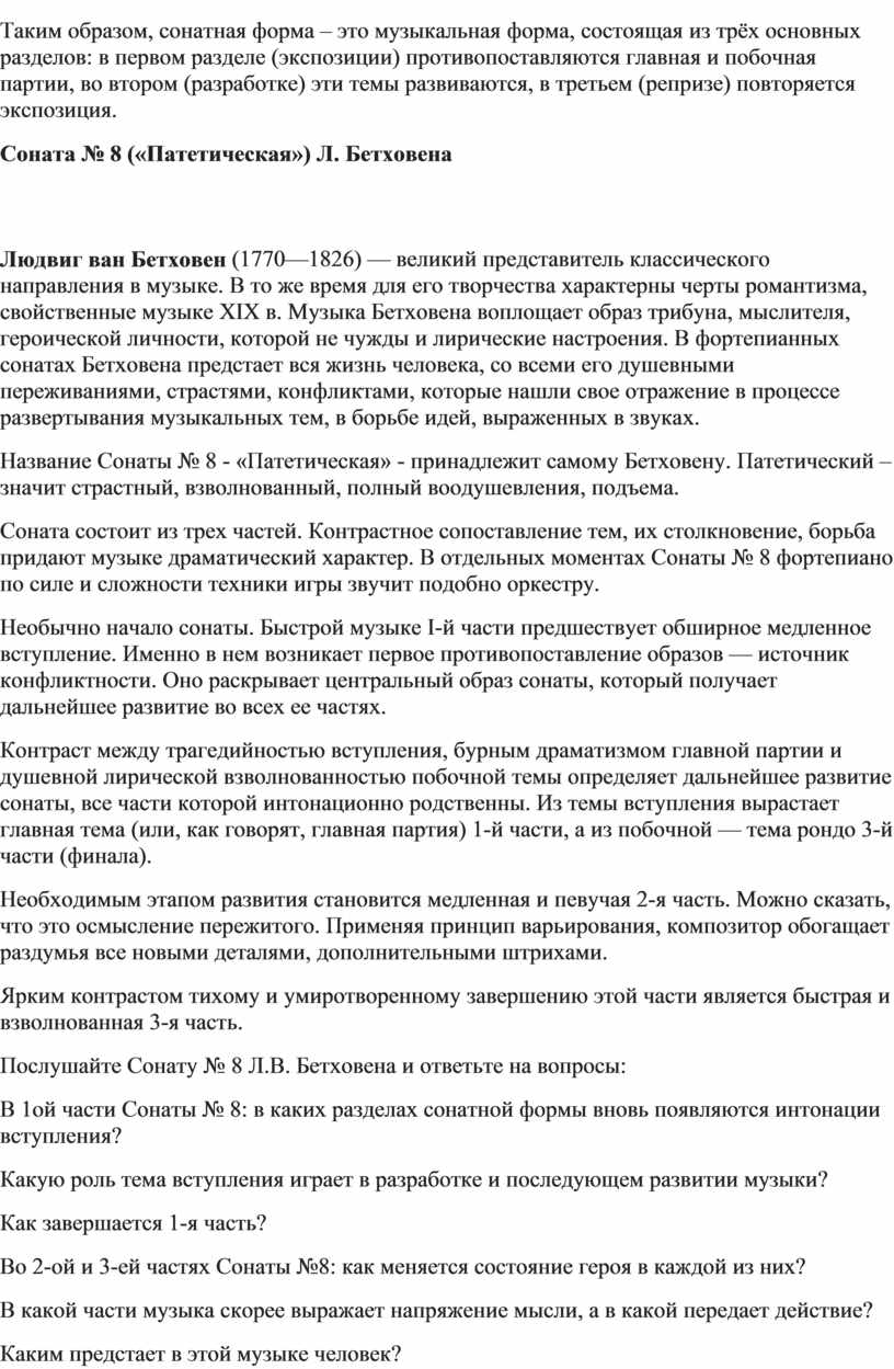 Таким образом, сонатная форма – это музыкальная форма, состоящая из трёх основных разделов: в первом разделе (экспозиции) противопоставляются главная и побочная партии, во втором (разработке) эти темы развиваются, в третьем (репризе) повторяется экспозиция.