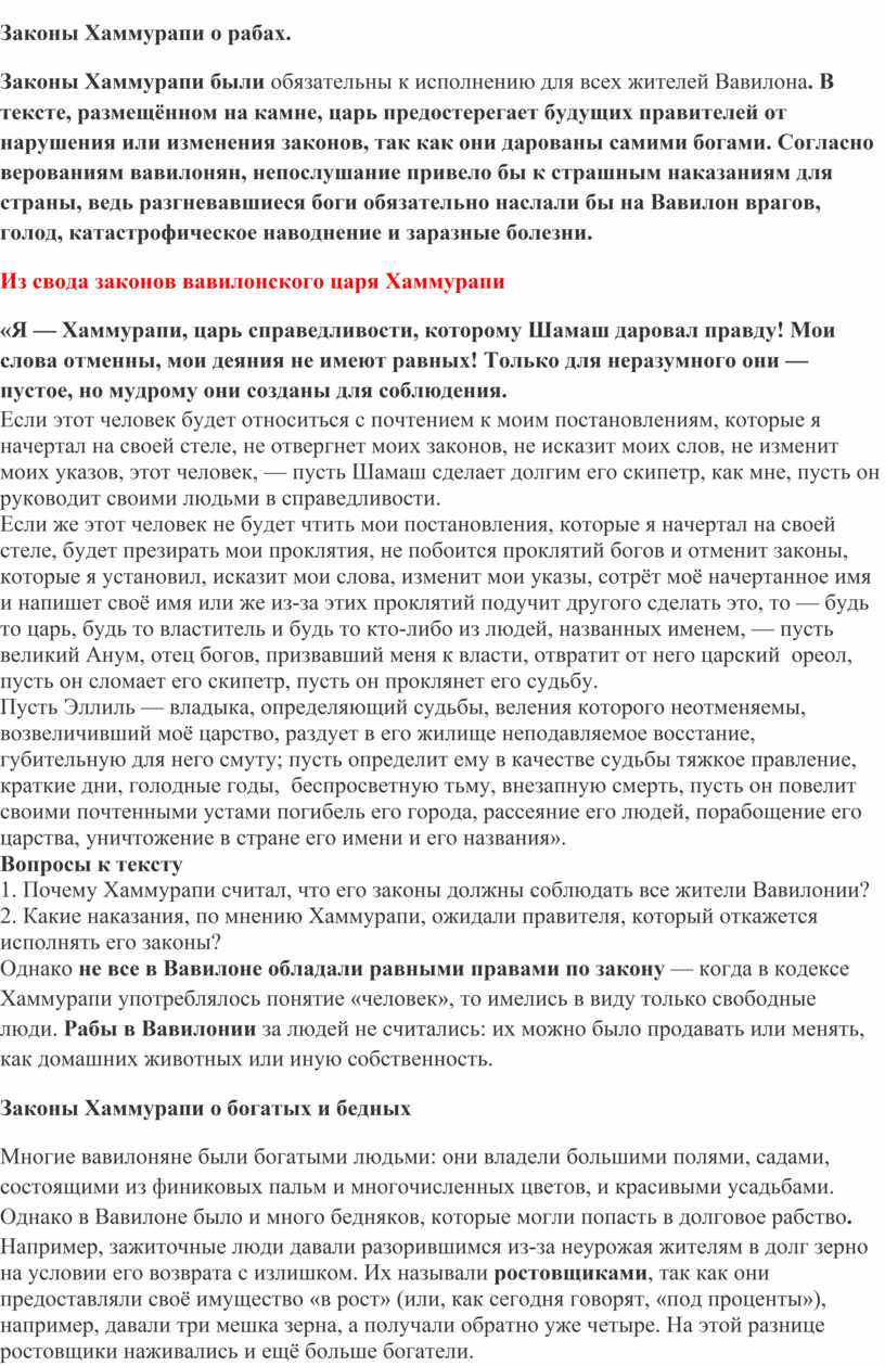 1. Почему Хаммурапи считал, что его законы должны соблюдать все жители Вавилонии?