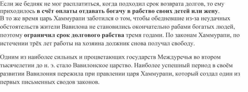 В то же время царь Хаммурапи заботился о том, чтобы обедневшие из-за неудачных обстоятельств жители Вавилона не становились окончательно рабами богатых людей, поэтому ограничил срок долгового рабства тремя годами. По законам Хаммурапи, по истечении трёх лет работы на хозяина должник снова получал свободу.