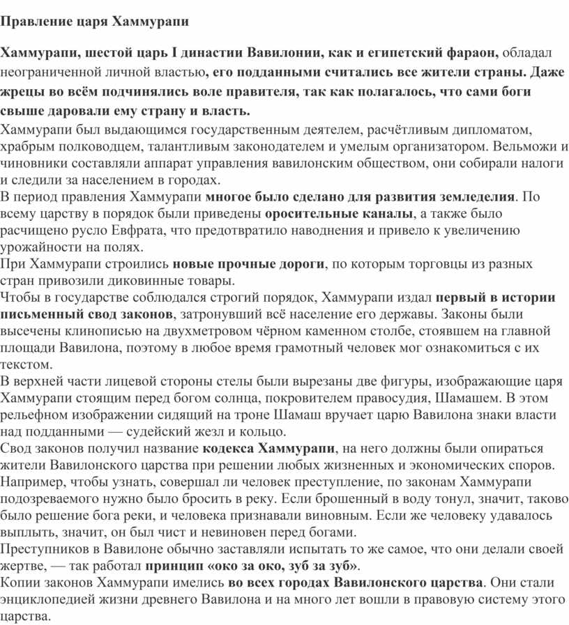 Лекция: «Вавилонский царь Хаммурапи и его законы».