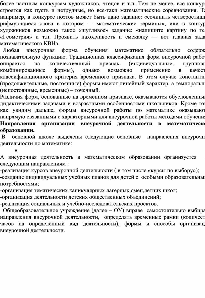 Различия форм, основанные на временном признаке, оказываются обусловленными дидактическими задачами и возрастными особенностями школьников. Кроме того, как увидим дальше, формы внеурочной работы по математике оказываются напрямую связанными с характерными для внеурочной работы методами обучения.