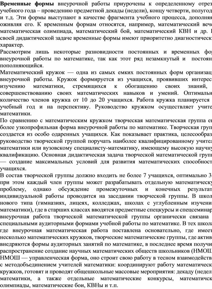 Рассмотрим лишь некоторые разновидности постоянных и временных форм внеурочной работы по математике, так как этот ряд незамкнутый и постоянно пополняющийся.