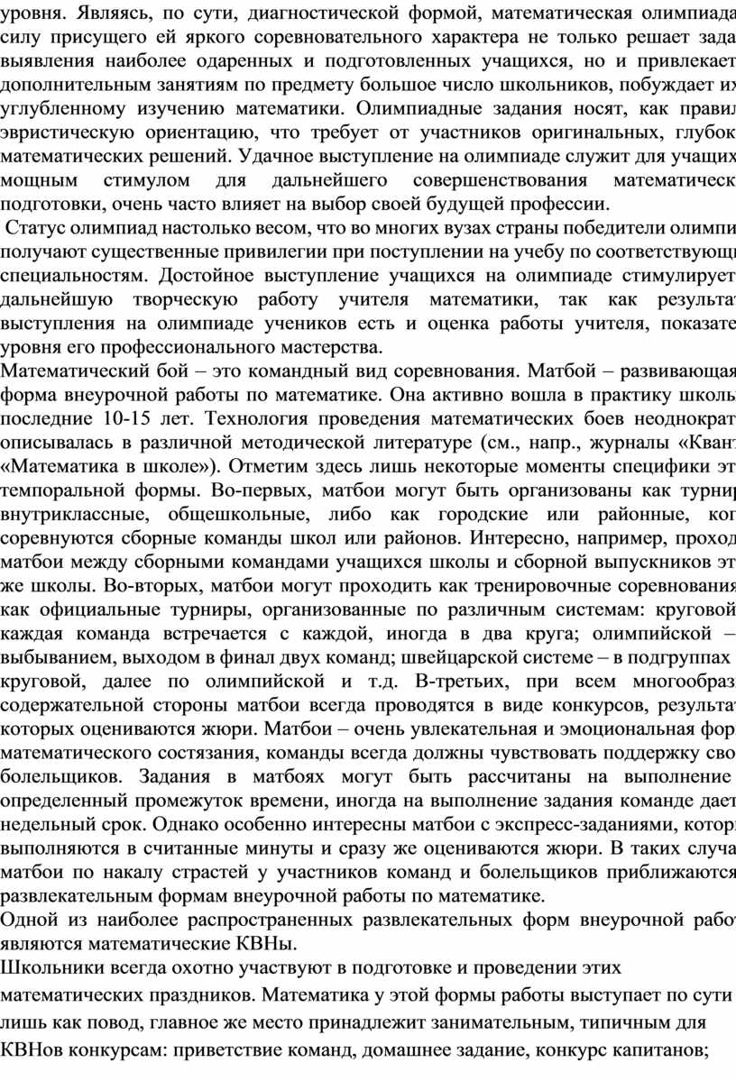 Математические олимпиады в последние годы получили так же широкое распространение в процессе обучения математике. Достаточно сказать, что уже прочно вошла в жизнь многоуровневая система организации олимпиад: внутриклассная олимпиада – школьная олимпиада – районная (городская) олимпиада – областная (краевая, республиканская) – всероссийская – международная. Причем победители и призеры олимпиадных туров более низкого уровня получают право участвовать в олимпиадных турах более высокого ранга. То есть олимпиады работают в системе от конкретного класса до международного уровня. Являясь, по сути, диагностической формой, математическая олимпиада в силу присущего ей яркого соревновательного характера не только решает задачу выявления наиболее одаренных и подготовленных учащихся, но и привлекает к дополнительным занятиям по предмету большое число школьников, побуждает их к углубленному изучению математики. Олимпиадные задания носят, как правило, эвристическую ориентацию, что требует от участников оригинальных, глубоких математических решений. Удачное выступление на олимпиаде служит для учащихся мощным стимулом для дальнейшего совершенствования математической подготовки, очень часто влияет на выбор своей будущей профессии.