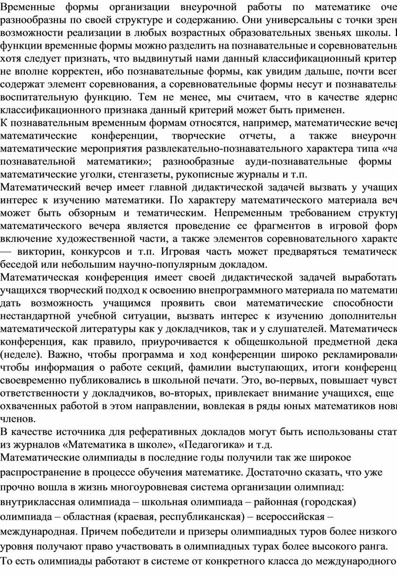 Временные формы организации внеурочной работы по математике очень разнообразны по своей структуре и содержанию. Они универсальны с точки зрения возможности реализации в любых возрастных образовательных звеньях школы. По функции временные формы можно разделить на познавательные и соревновательные, хотя следует признать, что выдвинутый нами данный классификационный критерий не вполне корректен, ибо познавательные формы, как увидим дальше, почти всегда содержат элемент соревнования, а соревновательные формы несут и познавательно-воспитательную функцию. Тем не менее, мы считаем, что в качестве ядерного классификационного признака данный критерий может быть применен.