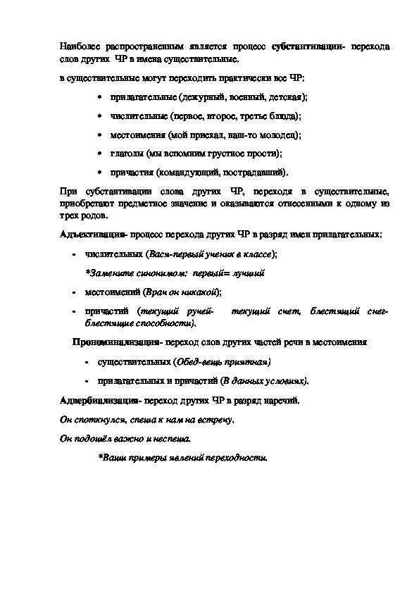 • Явления переходности в системе частей речи.Наиболее распространенным является процесс субстантивации перехода