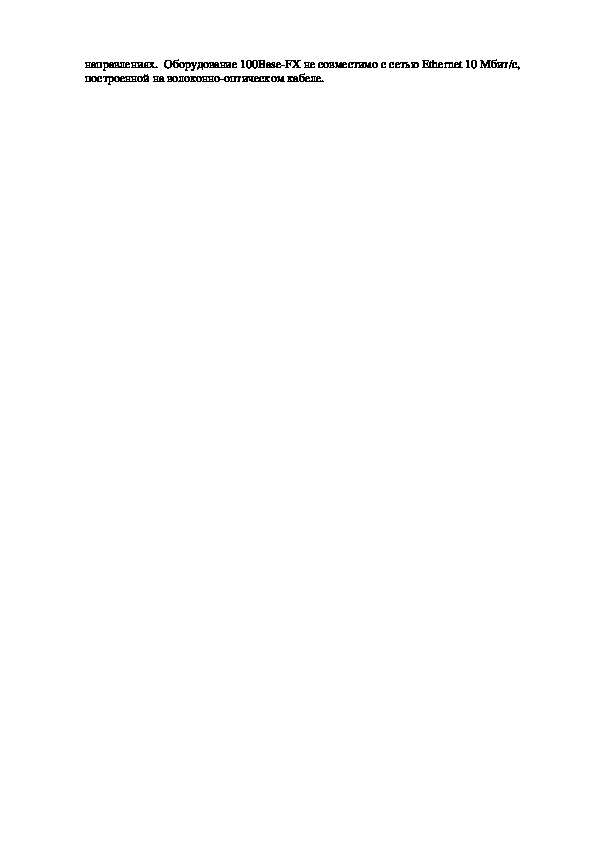 двумя оптическими волокнами, передача по которым осуществляется в двух различныхнаправлениях. Оборудование 100BaseFX не совместимо с сетью Ethernet 10 Мбит/с,