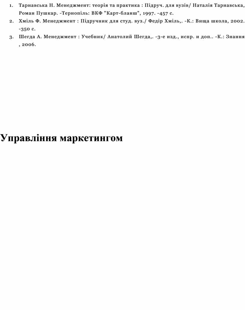 13. Тарнавська Н. Менеджмент: теорія та практика : Підруч. для вузів/ Наталія Тарнавська, Роман Пушкар. -Тернопіль: ВКФ "Карт-бланш", 1997. -457 с.